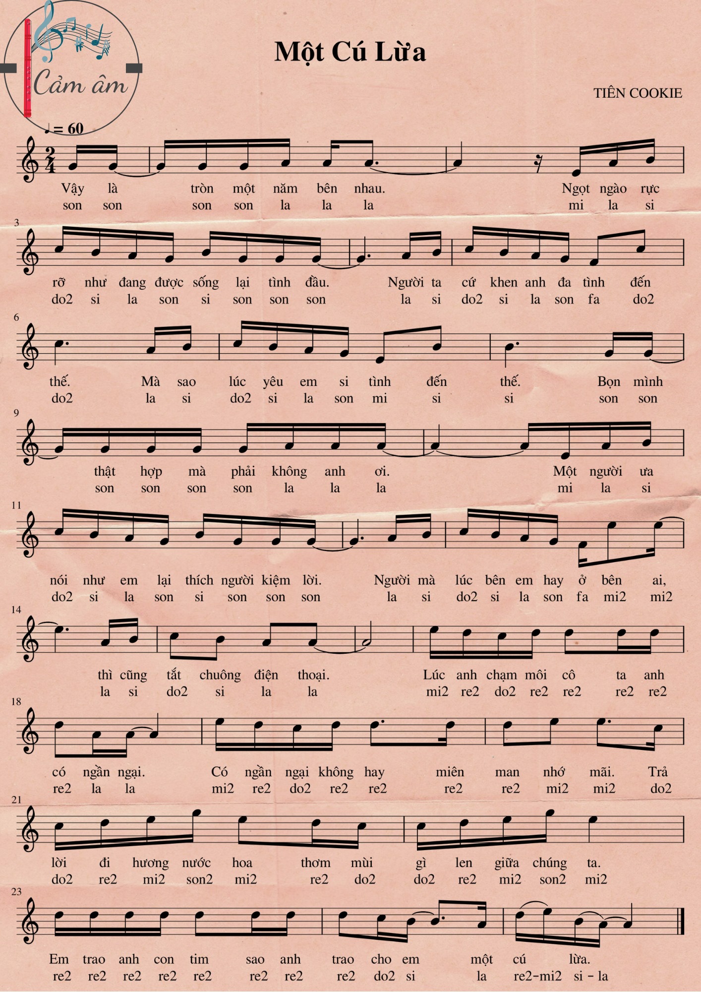 Trong bài viết này, mình xin gửi đến các bạn bản cảm âm Một Cú Lừa dành cho sáo trúc. Tuy đây là một bài nhạc trẻ hiện đại, nhưng khi chuyển thể qua sáo trúc lại mang một sắc thái rất thú vị — vừa tươi vui, vừa lạ tai, tạo cảm giác mới mẻ cho những ai yêu thích kết hợp nhạc pop với nhạc cụ dân tộc. Bản cảm âm được biên soạn theo dạng số dễ đọc, phù hợp cho các bạn mới tập sáo và những ai thích những ca khúc trẻ trung, vui nhộn.